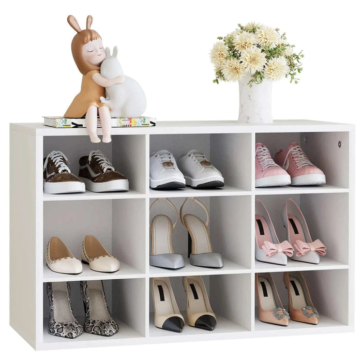 [【Save Space】The 9-cube shoe rack with a unique vertical storage design small footprint is the entrance porch front door living room bedroom garage closet and other small space storage choice. Help you make the most of your space and make your home more organized. 【Durable & Stable】This shoe rack for closet is made of high-quality MDF board and features a small cube structure design with strong load-bearing capacity and high stability. Splicing the back panel can also help enhance the stability of the shoe rack and effectively prevent dirty shoes from dirtying the wall. 【Multifunctional】With 9 cubbies not only can be used as a shoe cabinet to easily store 9 pairs of shoes. It can also be used as a Clothes storage cabinet at the end of the bed or a living room storage shelf for blankets books toys and more. 【Simplicity & Aesthetics】This shoe bench is sleek and elegant with a modern white finish. The simple appearance makes it suitable for any decorative style of room. Add a touch of beauty to your home. 【Easy to Assemble】The simple structural design allows you to quickly install this shoe rack. The simple and easy to understand installation steps included tools and labeled accessories make installation quick and easy.]