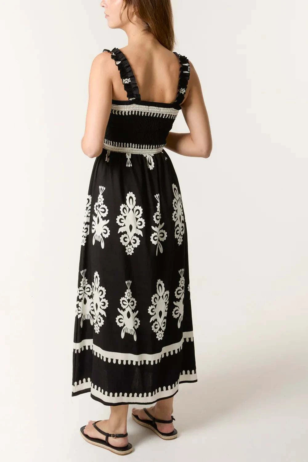 Elegant and versatile, this black printed maxi dress features a shirred bodice for comfort and a flattering fit. Perfect for holidays, evenings out, or relaxed summer days.